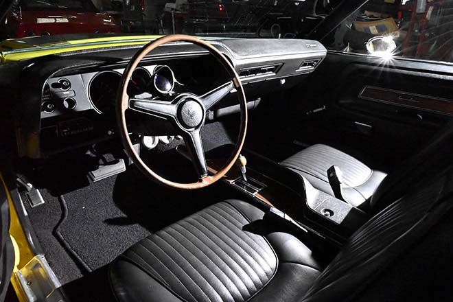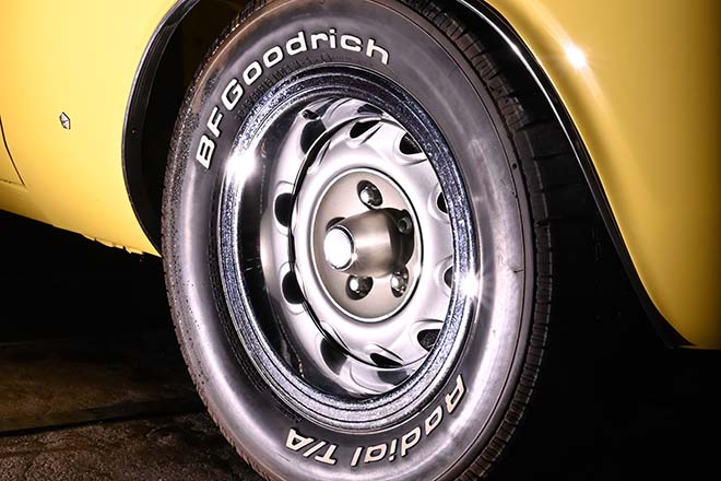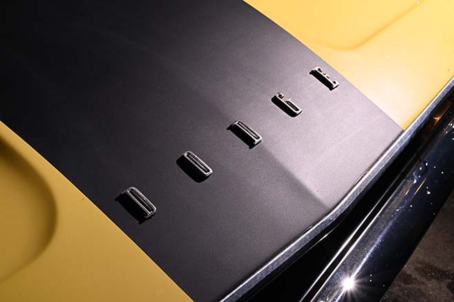 オリジナルの5.6ℓ 340エンジンを搭載。エーデルブロックのインテークマニホールド、キャブ、エアフィルターなど定番の手は加わりつつも、へダースやフローマスター50で図太いモパーマッスルサウンドを演出。当時物のデカールやバイナルトップ、スチールホイールの状態も非常にクリーン!