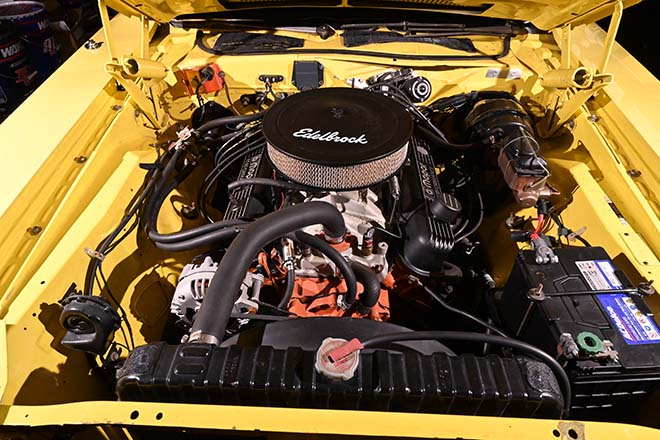 現車はオリジナルを忠実に守りながらエーデルブロックのインマニ、キャブ、エアフィルター、社外フロアロールバー、ヘダースにエキマニなど手を加え、オートゲージタコメーターや3連オートメーターの追加、Milodonオイルパンの換装を行ない、アップデート。眺めて楽しむコレクションではなく、走って楽しめるビンテージモパーに仕上がっている。