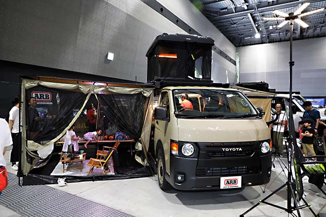 ARBアイテムも豊富に扱うフレックスドリームは、アウトドア派に人気のカスタムハイエースとLC250を持ち込んだ。LC250はARBバンパーにハイリフトジャッキを装着して展示した。