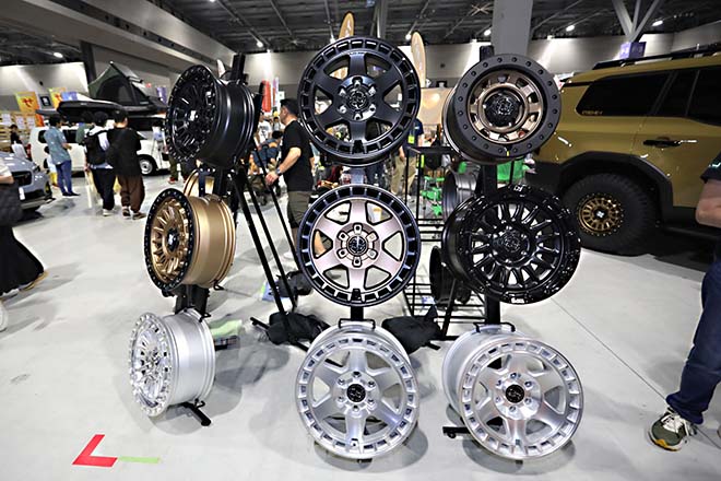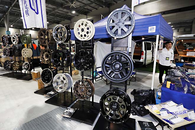 ホイールメーカーのRAYSとMID WHEELSは、TEAM DAYTONAのFDX-K、F6boost、D9、M9 アースカラーや、DODとのコラボしたウシャリン、ウシャリンバリなどを展示。