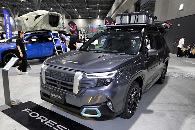 豊富な純正アクセサリーパーツも魅力の新型フォレスター。それらを装着したモデルに加え、ルーフトップテントなどを装着したクロストレックを展示。屋外ではアイサイトの体験走行を実施。
