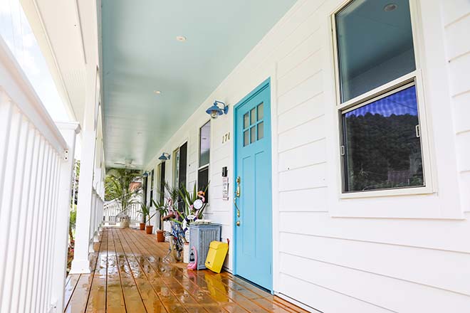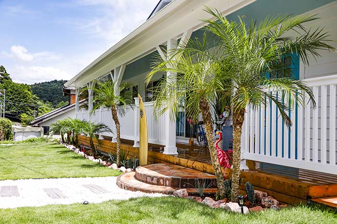 広くて長いカバードポーチも理想のひとつだった藤本さん。玄関前に植えたヤシの木などは、あえてジェネラルに頼まず藤本さん自らが土を耕し造園したもの。今後も改良予定だとか。