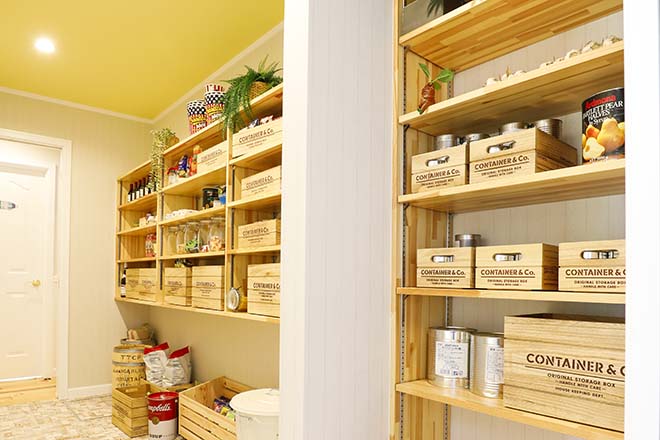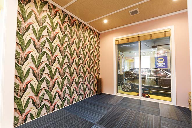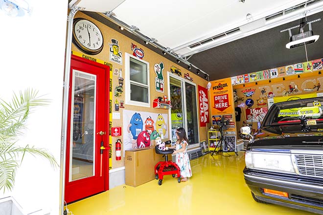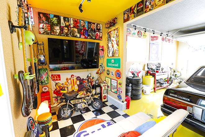 平屋建てが夫婦の希望で、大のクルマ好きである藤本さんが絶対条件としたのがインガレージ。「広さはもちろんですが、ガレージ全体を趣味部屋みたいにしたかったんです」。インガレージは床の色(イエロー)までこだわり、室内からも愛車グロリアを眺められる大きな窓も配置。飾るアメリカン雑貨は、「今まで全く興味がなかったけど、住宅に合わせてコツコツ収集しました(笑)」。