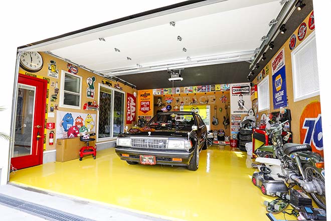 国産旧車が好きな藤本さんの愛車は日産グロリア。他にもクルマを所有しているが、ガレージに収めるのはこのグロリアだけ。広いインガレージが絶対条件だった理由は、夜でもクルマイジリがしたいから。床色にもこだわり、イエローを選択してガレージ全体を趣味部屋と捉えている。