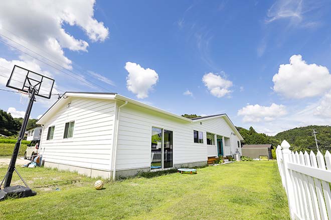 山に囲まれた藤本さんの故郷に、2024年6月に完成した藤本さん邸のサーファーズハウス。200坪という土地の広さがあり、子供たちの遊び場である芝の庭も広大。因みに、ガレージ前にサーファー御用達の外シャワーが設置されているが、藤本さん夫婦は遠い昔にサーフィンを経験したのみと言い、あくまでも雰囲気づくりだそうだ。