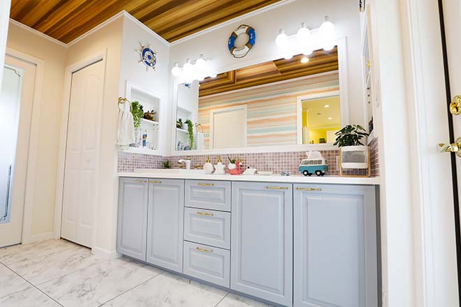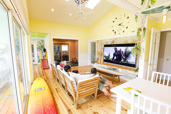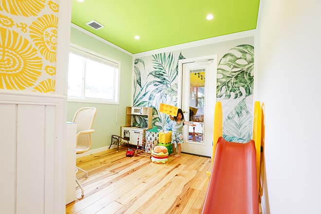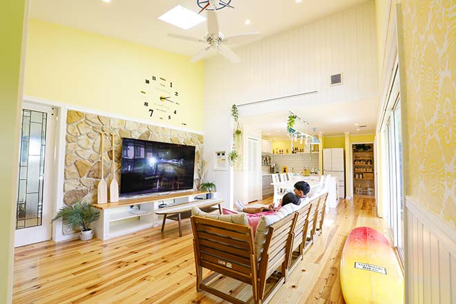 5LDK となる藤本さん邸は、和室・寝室・子供部屋・トイレといった各エリアの壁紙がバリエーションに富む。それでいてリビングの壁紙は当初白で施工したようだが、「ここだけ地味に感じて」とイエローに変更。これが大正解だったようで、家全体が明るく楽しいイメージに仕上がった。また、TV 側の岩壁、天井吹き抜けシーリングの航路指針など、思い切ったデザインを取り入れることで他には無いオリジナリティある雰囲気になっている。「迷ったら派手な色」は、藤本さん夫婦の格言だ。