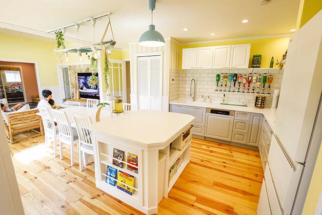 一方の奥様は、「どこに居ても家族を感じられる開放的な空間と、家族が多いので周回導線、あとは子供たちと料理ができるアイランド型の広いキッチンを希望しました」。