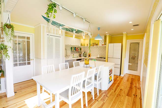 奥様が一番こだわったダイニング・キッチン。子供たちと一緒に料理ができるアイランド型にし、細かい収納もオーダーで依頼。7人家族であるため備蓄の食品は多く、パントリースペースは最大限確保。キッチン側と廊下側に繋がるドアを配置し導線もスムーズ。サーフボードの照明は夫婦の手作りだ。