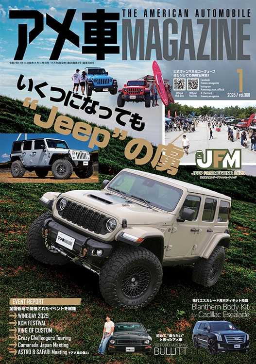 アメ車マガジンが主催して543台のジープファンが富士山の麓に集まったイベント「ジープファンミーティング2025」のレポートを筆頭に、全国各地のジープファンの集い、ジープオーナーの横顔紹介、最新のジープカスタマイズなど、日本国内の最新のジープ事情が満載。
