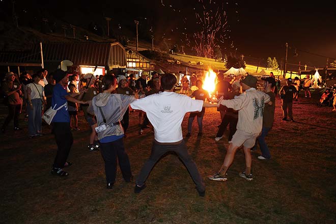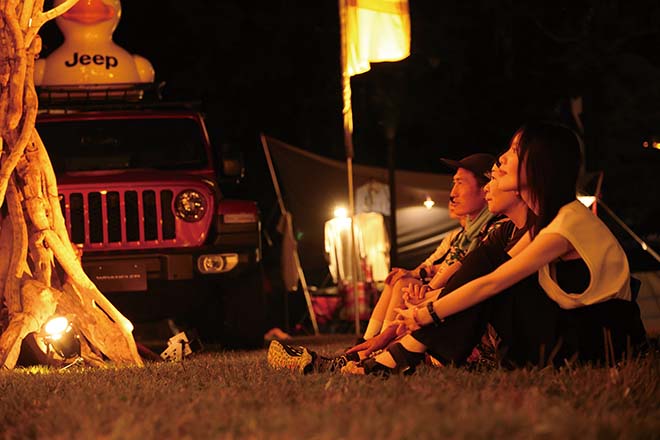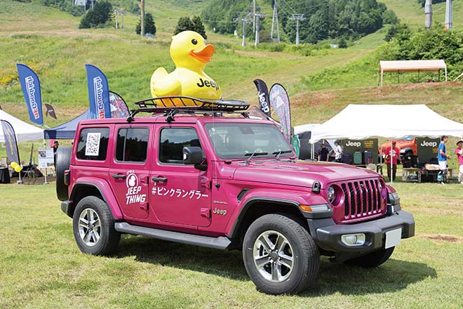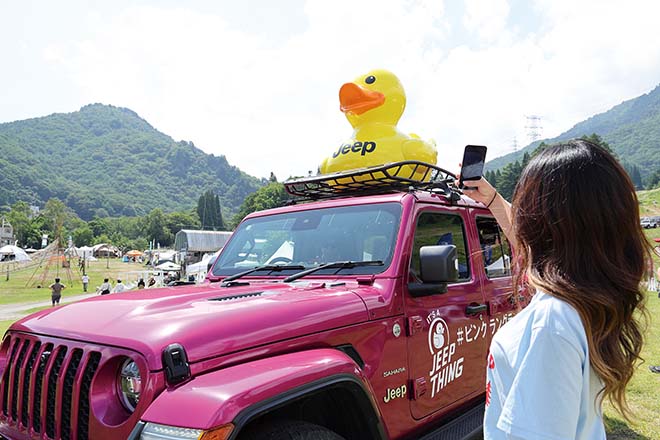 Jeepエリアではオーナーラウンジが用意されたほか、ダックを載せたピンクラングラーも展示され、記念撮影をする来場者も多かった。またJeepグッズの販売やBF Goodrichのタイヤも展示された。日が沈んでからも音楽ライブのほか巨大なキャンプファイヤーを囲んでのフォークダンスなどが行なわれ、多くの人が参加して一体感を満喫。