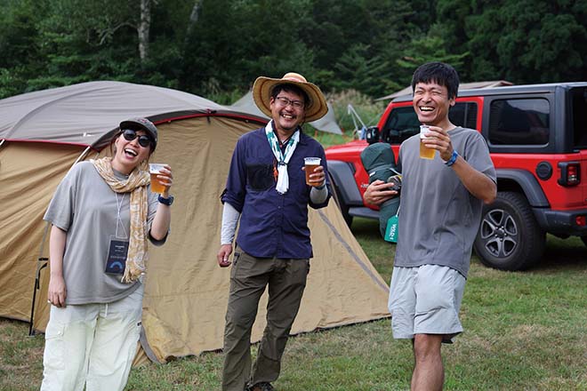 キャンプイベントだからこそ味わえるのがビール。汗をかいてテントを立てた後の一杯はまさに至福。キャンプサイトはこんな笑顔の来場者でいっぱいだった。