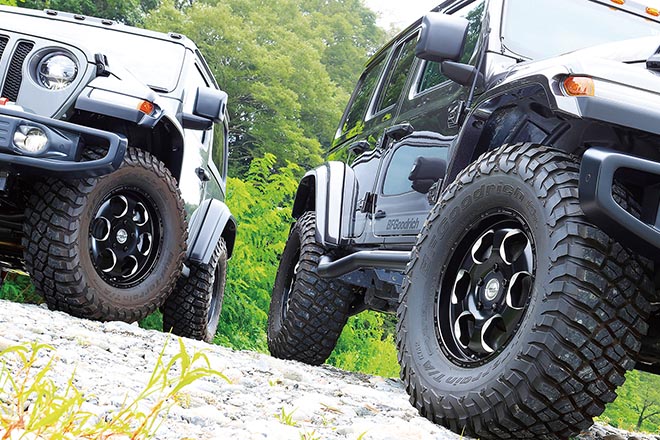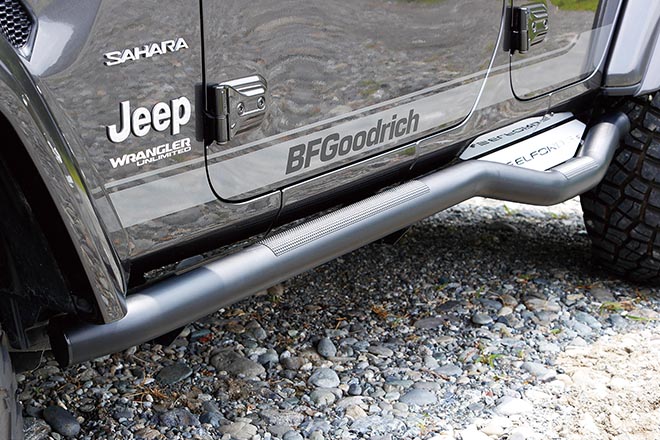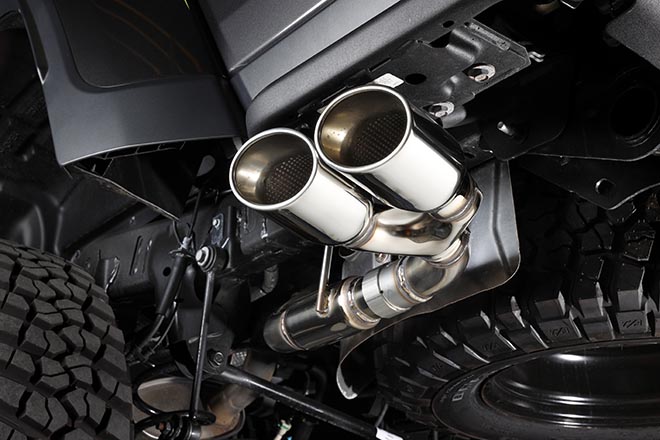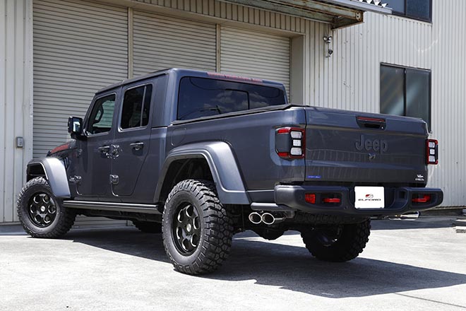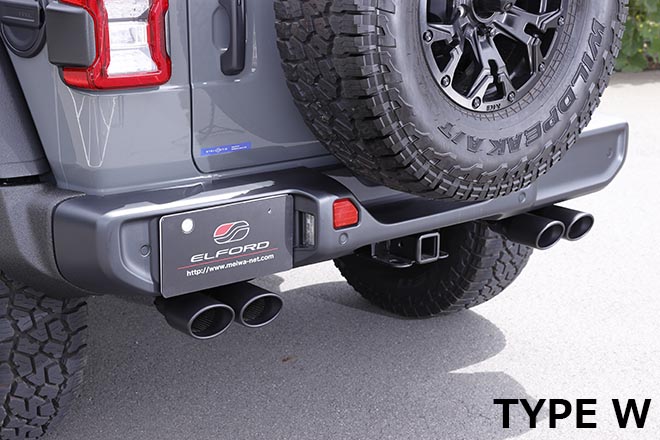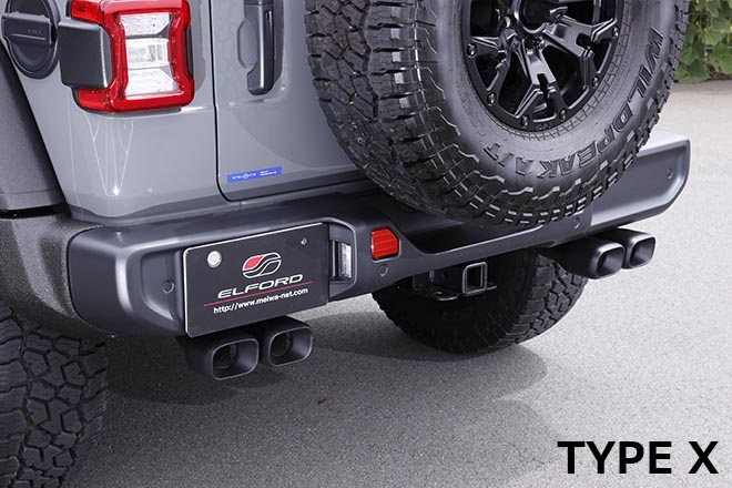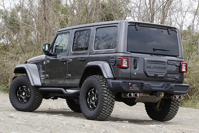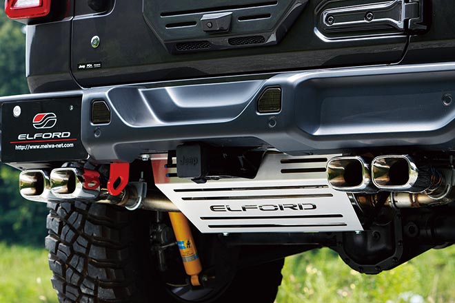 ほかにも、リアのナンバープレートを避け左右にテールエンドをレイアウトしたウルトラパフォーマンスマフラーは、エンド形状がスクエアとオーバルの2種類を設定する。非常にアグレッシブなデザインではあるが、保安基準を満たしているので全国のジープ正規ディーラーでの装着事例は非常に多い。加えて国産マフラーの多くはポリッシュ仕上げがほとんどだが、エルフォードではポリッシュだけでなく落ち着いたマットブラック塗装も発売中。