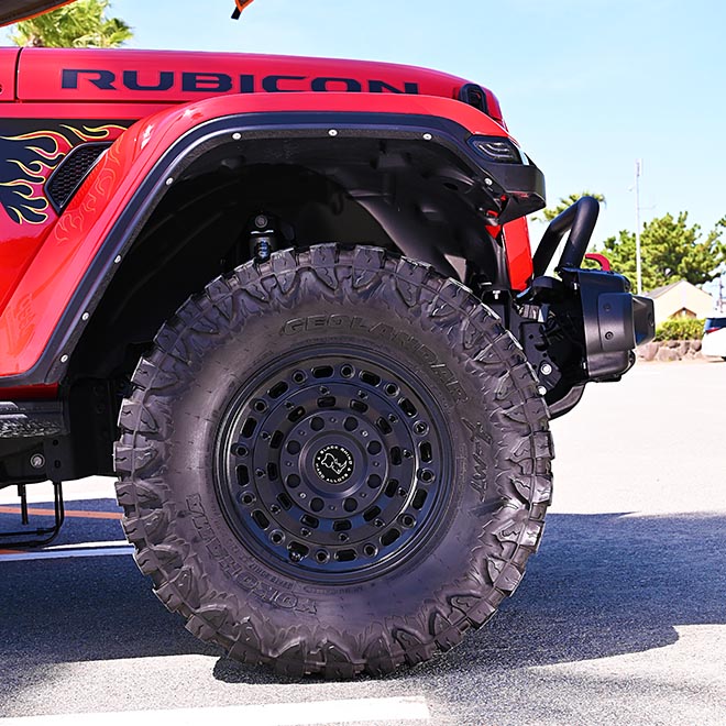 MOPAR純正キットで2インチリフトアップを施し、BLACK RHINO 17インチホイールに35インチのジオランダ―X-MTをセット。