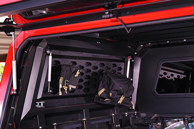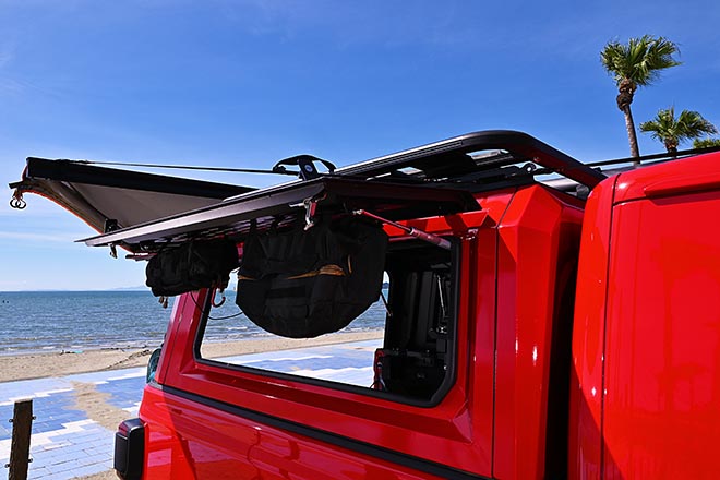 シートにはボディ同色の赤いグラディエーターの文字が刺繍され、リモコンキーケースも赤のハードタイプでコーディネイト。キャノピー部分はサイドウインドーが可倒式となっていて、奥の荷物を横からも取り出せるから便利!