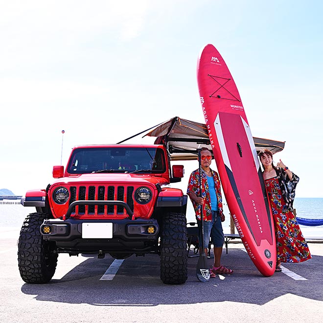 ロングホイールベースのグラディエーター。その荷台部分にキャノピーを追加することで長いJLラングラーの様なフォルムへと誘う南さんのジープスタイル。夏はSUP、冬はキャンプ、グランピングと1年中アウトドアを嗜むファミリーにマストなベッド部分の広大な荷室スペース+キャノピーの魅力に迫る!