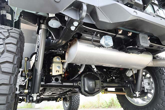 注目すべきは足回り。車重のある4xeに合わてMETALCLOAK製デュアルレートコイルとテラフレックス製ファルコンショックを組み合わせて3.5インチリフトアップ。RPM製のステアリングリンケージやトレーディングアーム、フロントショックにマウント装着によりストローク性能が向上している。足もとには38インチのニットー・リッジグラップラータイヤを採用。ホイールにはFITTIPALDI OFFROAD製の20インチを選択。ワンピースのビードロックで、強い存在感をアピールする。