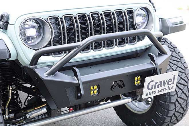 前後バンパーは迫力あるデザインが魅力のファブフォース製に換装。ルックスだけでなく、強度も兼ね備え、フロントにはフォグを内蔵するなど機能面でも満足できるスペック。サイドステップにはグラベルオートサービスオリジナルの電動ステップを装着。テールランプはオラクル製で、これもグラベルオートサービスがいち早く日本に紹介したパーツの一つ。