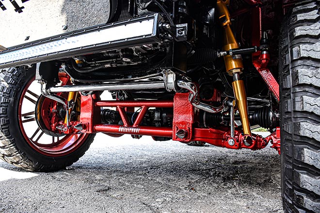 オフローダー系御用達のN-fabのフロントバンパーにADDのリアバンパー、リムはアメリカンフォースの42インチ、KRZのビッグブレーキ、サスペンションはBULLETPROOFの12インチリフトキットにリアを4リンク化した上で、SKIPPERのハイドロをインストール。