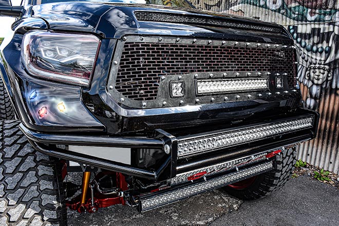 フロントグリルにはリムと同じくRBPのカスタムグリルをあしらい、フロントバンパー内にはLEDライトバーをセットして個性あるフロントフェイスを創造。