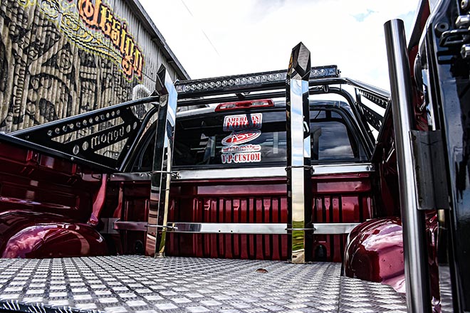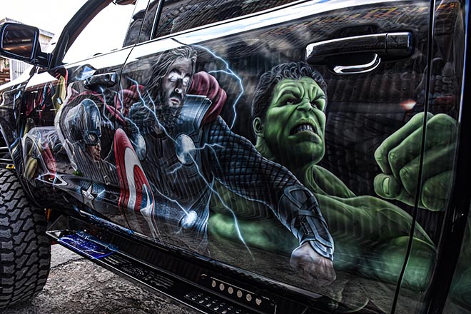 それにリアベッドから突き出したマフラーなど、カスタムポイントを挙げたらキリがないといった感じだが、極め付けはボディというキャンバスに描かれたマーベルコミックのキャラクターたち。まさに存在感は半端ない。