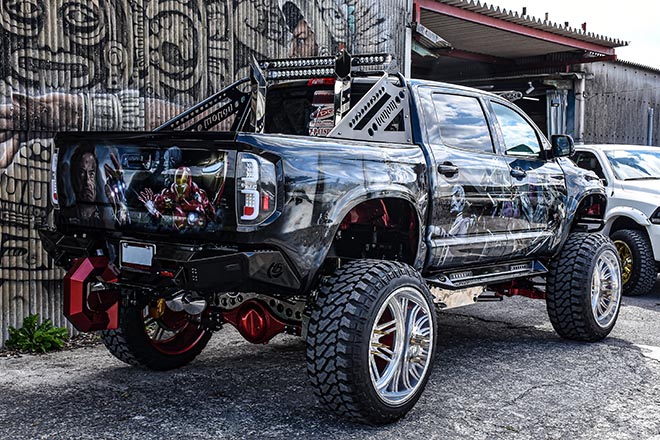 そしてもう一台はというと、この界隈では知られたSenuma氏のタンドラ。ここ最近では珍しい10インチ以上のガチ上げっぷりはお見事というほかなく、以前紹介した時からもさらに進化し続けており、ボディにはアメコミのキャラクターが描かれ、まさにヒーローそのものといったスタイリングと言える。