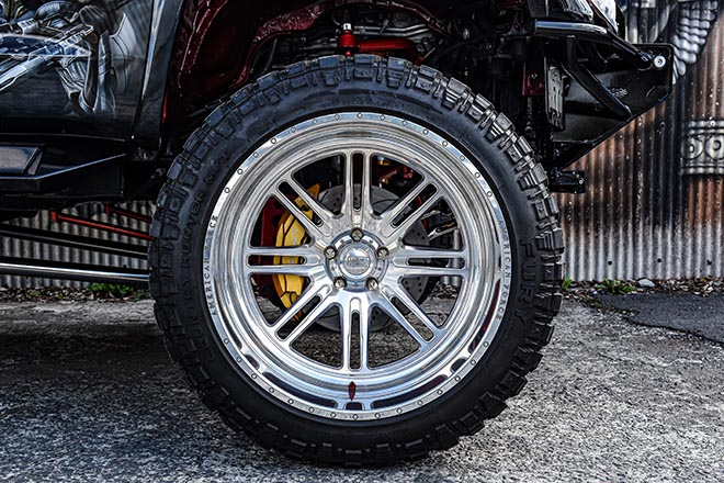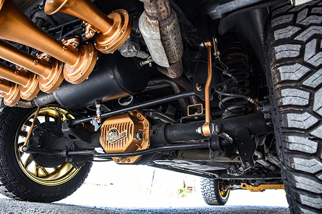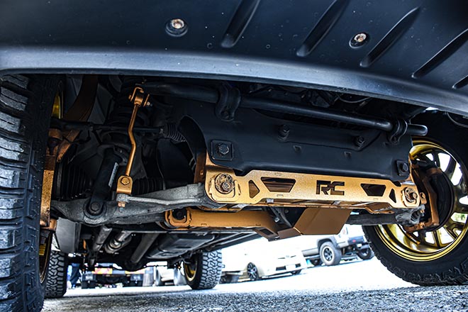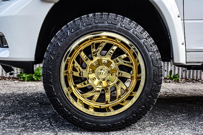 リムは22×12JのRBP 65R GLOCK。元はクロームだったものにキャンディペイントを施している。タイヤはFURY COUNTRY HUNTER R/Tで、サイズは35×12.50R22を組み合せる。そしてラフカントリーの4インチアップキットでハイト。こちらもゴールドへとペイントされている。