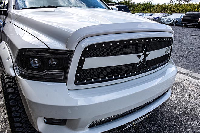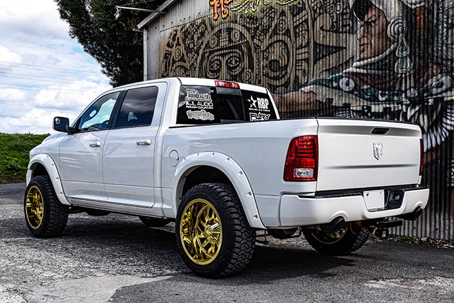 まずはホワイトのボディにゴールドのボトムスが映えるダッジ・ラム。サスペンションにはラフカントリーの4インチアップキットをインストールし、ボトムスにはRBPの22インチリムに35インチのMTタイヤをセット。さらにリフトキットはゴールドに、リムはキャンディゴールドのペイントを施すことで、迫力だけでなくビジュアル的にもインパクトを与えている。