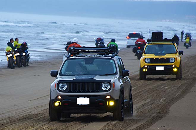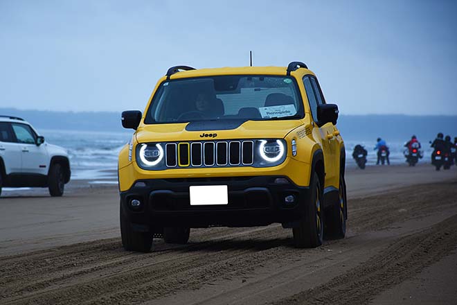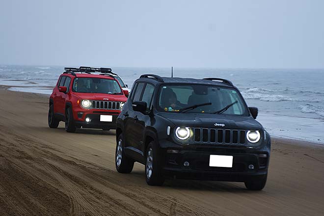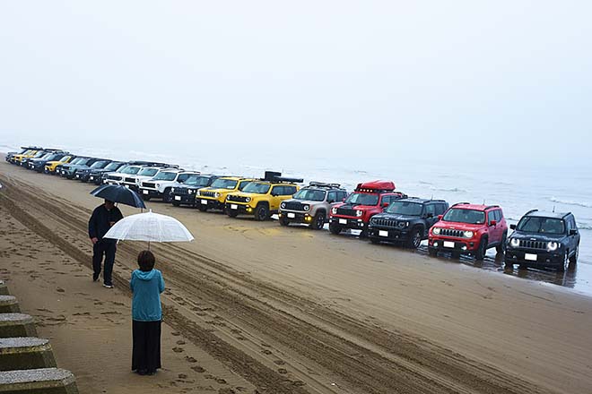 日本自動車博物館での会合を終えた後は、希望者のみが千里浜なぎさドライブウェイに向かってツーリング。ここは日本で唯一クルマで走れる砂浜。せっかく石川まで来たのであればということで目指した場所だ。この日はバイクのイベントが行なわれていたことでごった返し、しばらくすると雨が強くなってしまったものの、それでも貴重な体験にレネゲードオーナーたちは喜んでいた。