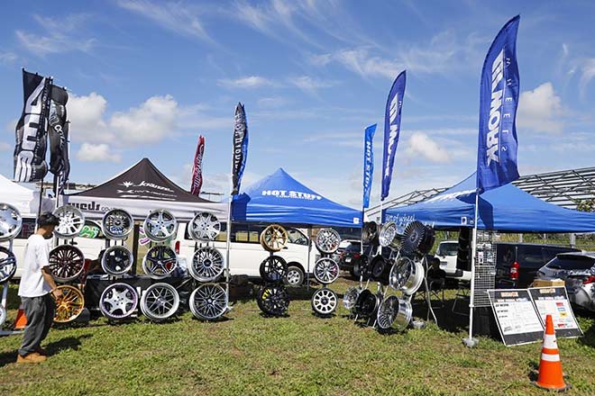 広い会場の中心にエントリー車が並び、それを囲むようにショップやメーカー系のブースが立ち並ぶ。エントリー車同様にオールジャンルのショップが並ぶが、アメ車ビンテージを扱うショップやラングラーなどのオフロードショップが目立った。また、ワークなどホイールメーカーも多く出展し、幅広いカスタムに合うアイテムを展示していた。