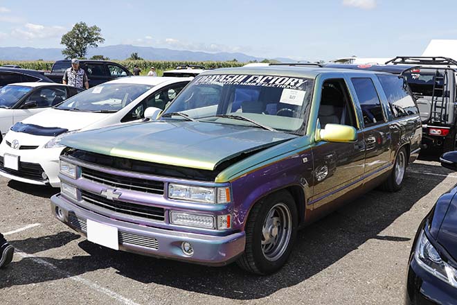 マジョーラボディのサバーバンを見て「何処かで見たことあるかも」と思い声を掛けると、尾林ファクトリーのデモカーを2024年の5月に購入したと語るオーナーの相山さん。前車はハイゼットのフルオーディオカーに乗り、サバーバンが初のアメ車のようだ。