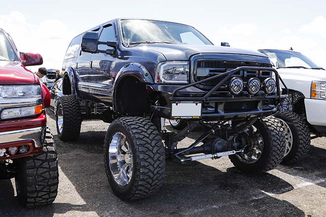 会場に並ぶエントリー車のなかでも、群を抜いて「てっぺんが高かった」田村さんのエクスカージョン。大きく空いた車体の下で寛ぐ家族の姿が印象的。8年前にローダウンのカプリスワゴンから乗り換え、徐々にリフト化して現在は13インチアップ。通勤でも使用中。
