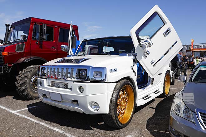 アストロやナビゲーターなど、過去に様々なアメ車に乗ってきた西片さん。現在の愛車H2は、出張で愛知に行った際にアズールモータリングで「お土産」として購入したもの(笑)。ゴールドのジオバンナ28インチホイールは、普段乗りでも愛用している。