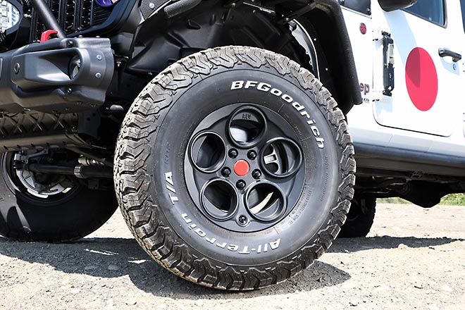 Jeepを主軸にした、USカスタムパーツメーカーのAEV。この正規輸入代理店として、輸入・販売を行っているのがリンエイ。ダンパー、コイルスプリング、ラテラルロッド、ステアリングダンパーなどがセットになったAEVの2.5インチアップキットほか、5ホールのレンコンデザインホイールとなる、AEVのSavegrell(8.5J×17 +25)も人気のアイテムとなっている。