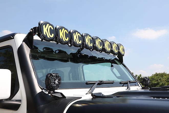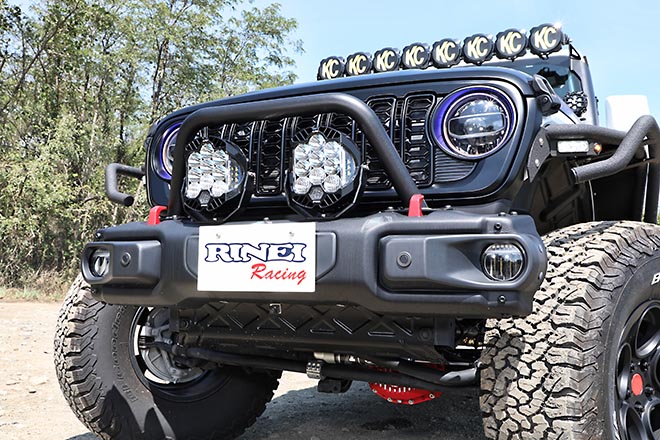 さらにルーフ、ボンネット、フロントバンパーに装着したライティングカスタム。ルーフとボンネットにはKC、バンパーにはBAJAを装着。ヘッドライトはLEDのイカリングタイプを装着。リンエイらしいメイクでラングラーを昇華させている。