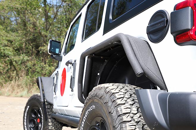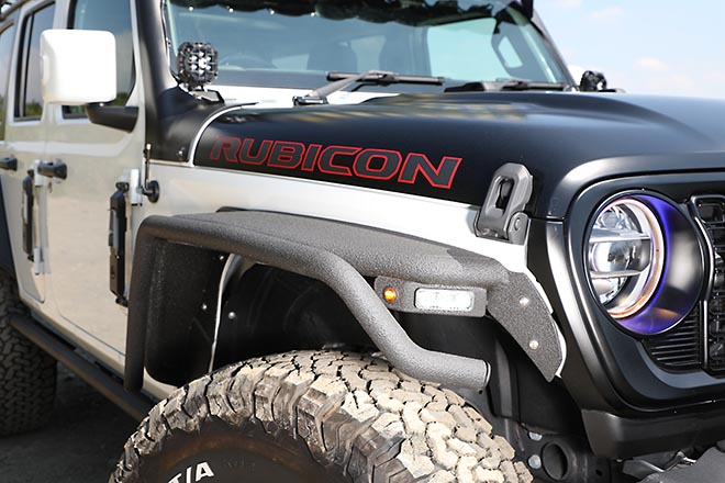 37インチのタイヤを覆うフェンダーとして、FABTECHのフラットデッキフェンダーを前後に装備。さらにリンエイオリジナルのチューブフェンダーをプラスすることで、ハミタイをカバー。また、フラットデッキフェンダーとチューブフェンダーにはLINE-Xが施されている。