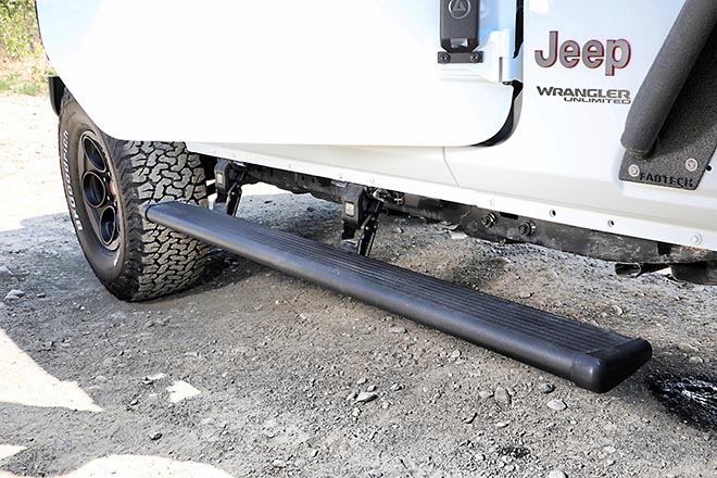 フロントバンパーはアプローチアングルにも有利に働き、かつ堅牢なスチール製のMOPARルビコン用をサイドショート化してインストール。大径タイヤがフロントからもよく見えるようにすることで、より迫力の増したエクステリアを実現している。サイドステップは日常での利便性を重視して電動格納式を採用。ドアの開閉に瞬時にリンクして昇降するステップだが、ラングラーシリーズへの電動サイドステップをいち早く取り入れたのはリンエイなのだ。