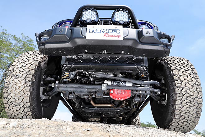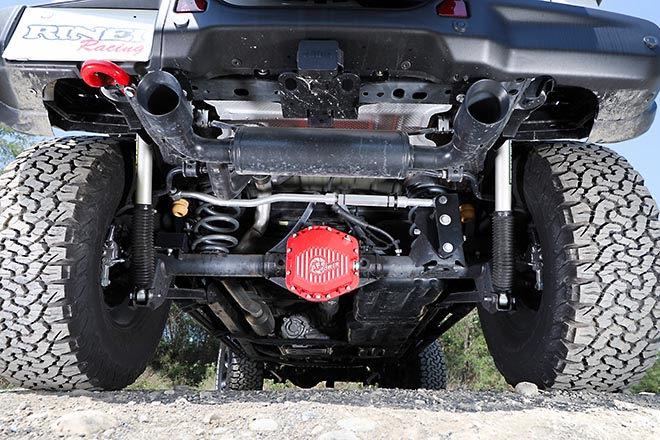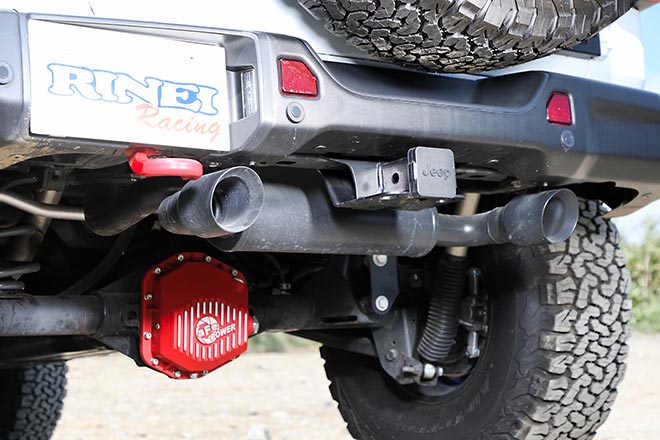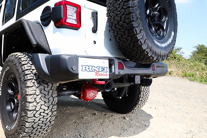 AEVの2.5インチアップキットと37インチのタイヤにより、約3.5インチアップを実施。前後のデフには赤いカラーが目を引く、aFe POWERデフカバーをインストール。冷却フィン付きのデザインとなっている。