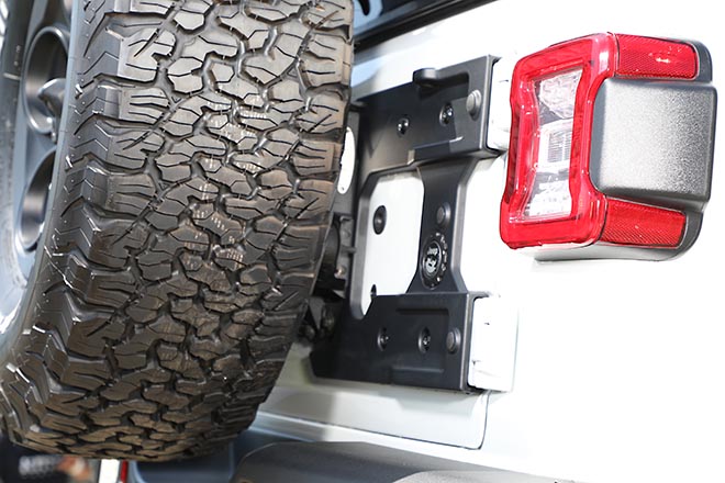 ボディカラーは純正のスティンググレーからホワイト×ブラックへとオールペイントを行ない、さらに37インチの大径タイヤ、AEVの17インチホイール、AEVの2.5インチアップキットのインストール、ワイドなフラットデッキフェンダー+チューブフェンダーの装着で、ワイドでハイトなエクステリアを合法的に実現している。ちなみにフラットデッキフェンダーとチューブフェンダーは、キズが付きにくいLINE-Xを施工することで、高いラギッド感も演出している。