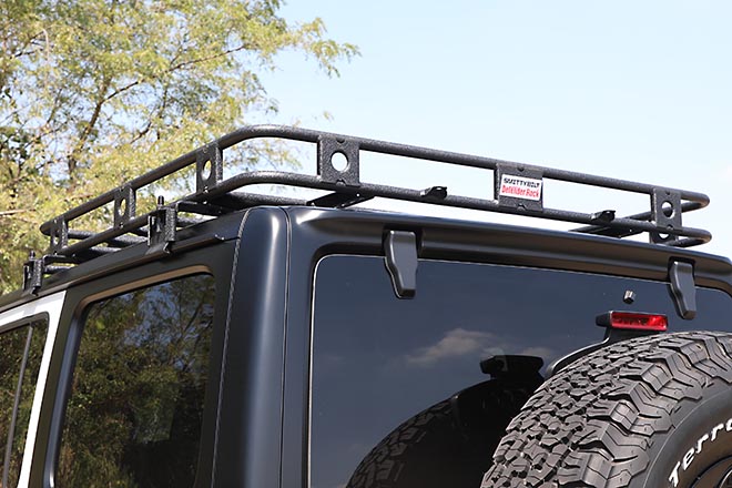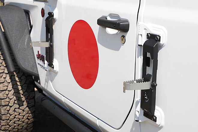 フロントルーフの開閉を邪魔することなく、スタイリッシュなデザインのSMITTYBILTのDEFENDER Rackを装着。左右のドアには、ルーフへのアクセスを容易にするATLASの格納式ドアステップを装備する。