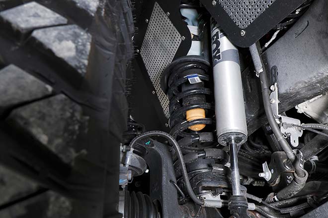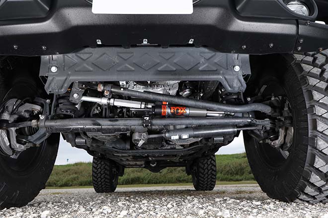 MOPARの2インチキットをインストール。コイルスプリング、ショックアブソーバー、ラテラルロッド、ステアリングダンパーを組み込み、37インチとの組み合わせで約3インチアップを実現。
