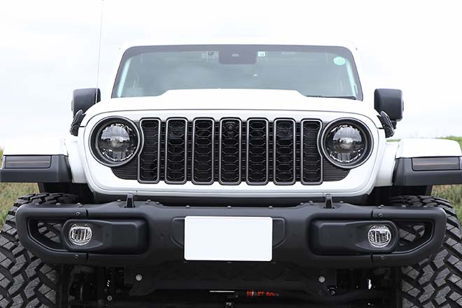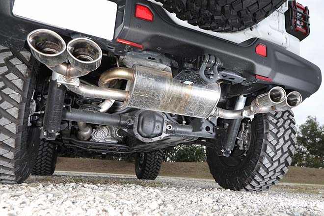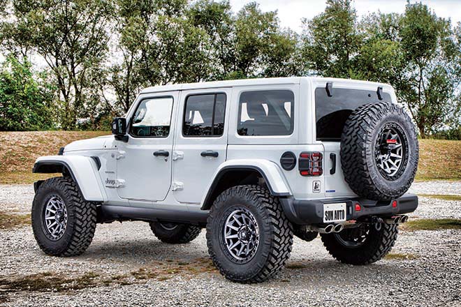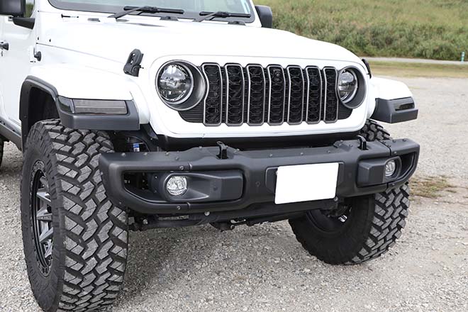 フロントバンパーにMOPARのルビコン用を装着したことで、37インチのタイヤをフロントからも見えるようにしている。ステップはドアの開閉とリンクして昇降する電動式を採用した。シルバーの左右4本出しのマフラーは、車検対応のジェップセン。このマフラーも含めて、すべてのカスタムを合法としている。それでいながら、ノーマルにはない迫力が得られている。