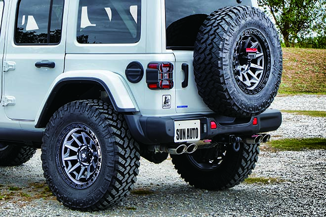 サンオートでもっとも人気のあるカスタムが、ここに登場する約3インチアップしたメニューだ。リフトアップにはMOPARの2インチアップキットをインストールし、このサスペンションにもマッチする37インチのM/Tタイヤを装着。これにより、ハイトでワイルドなエクステリアを実現。
