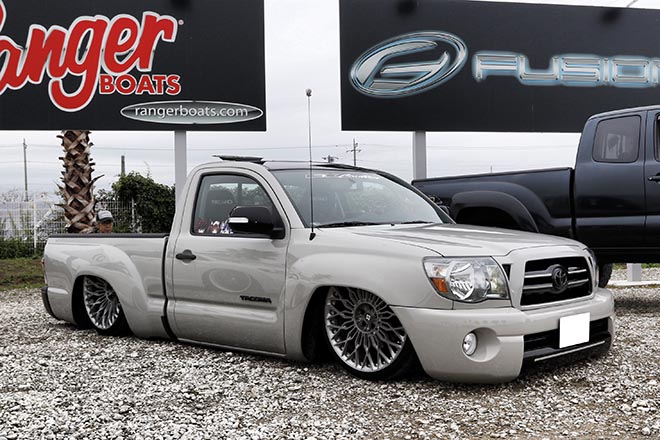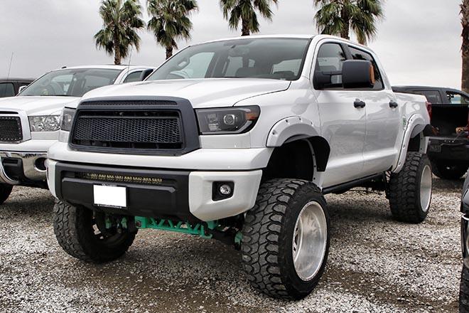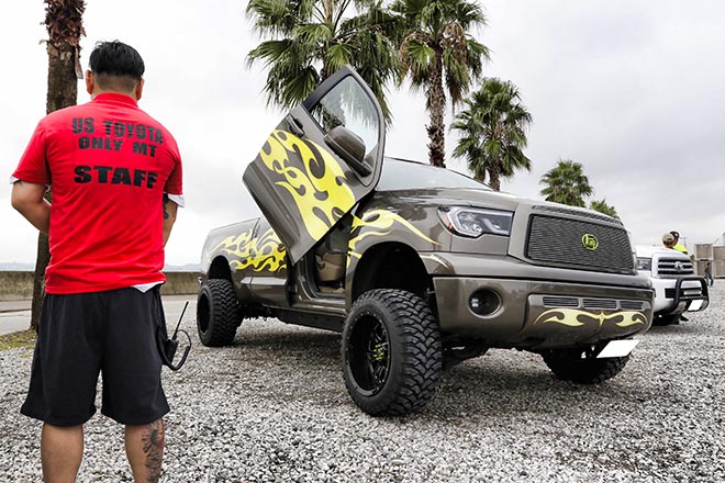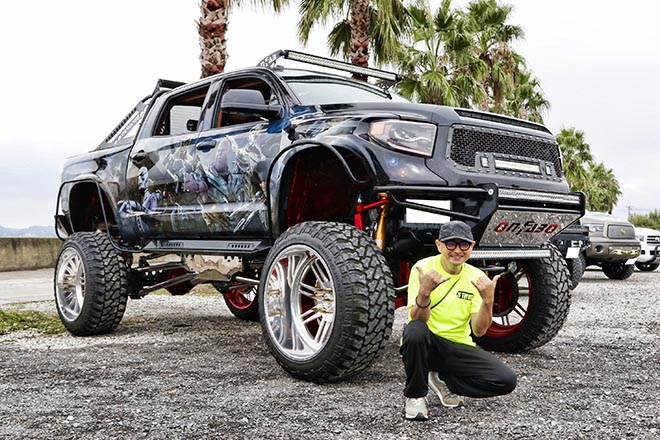 10インチアップの車高にシザースタイプのガルウィングを装着したタンドラオーナーのトモさん。足回りはハイドロが組み込まれており、4輪独立での車高調整が可能! HAMMAR DESIGN art studio JPNで製作された車両で、今後はさらなるオールペンを行なう予定とのことだ。