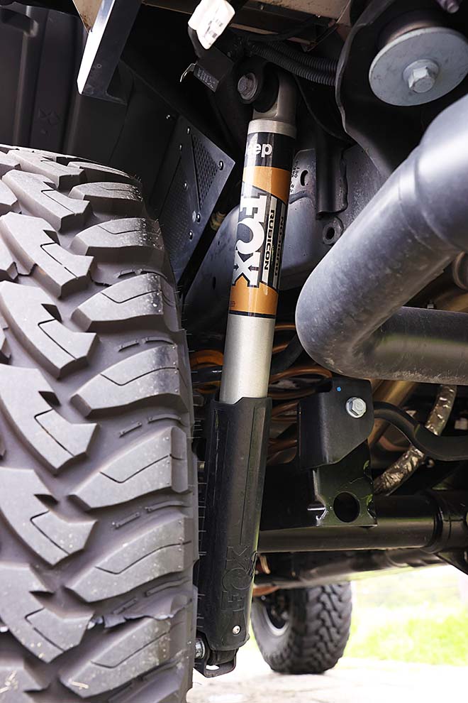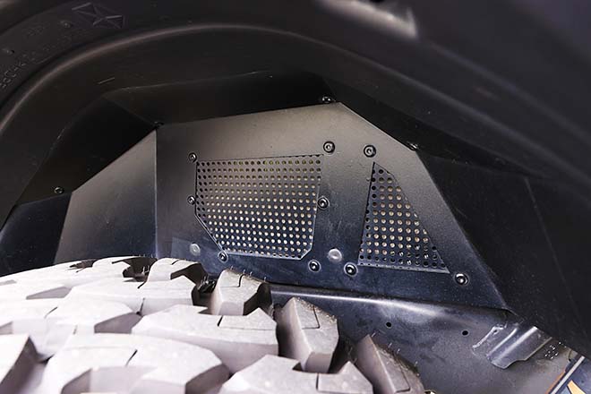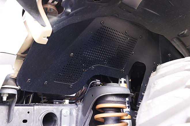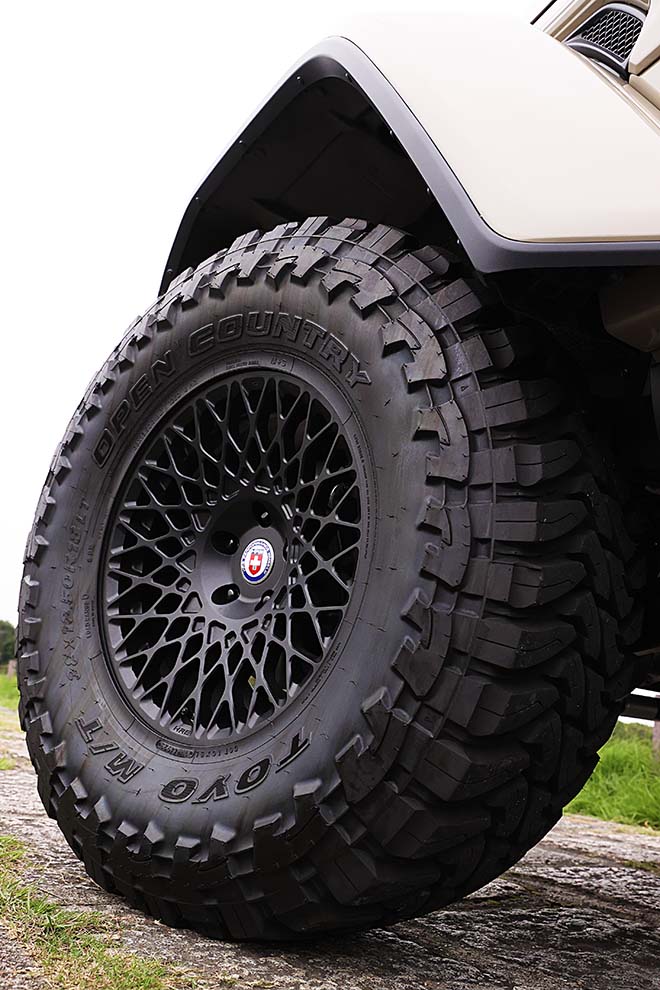 ホイールは高級車での装着率が高い、HREのヴィンテージシリーズM501をチョイス。タイヤは対照的なオープンカントリーM/T(38 ×13.5R18)をセット。エンジンなどの汚れを防ぐ金属製のオリジナルインナーフェンダーも発売中だ。
