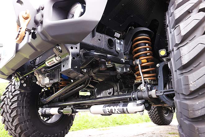 392純正にテラフレックス1.5コイルスペーサーを装着。またアイシンAW製のMCBをフレーム先端に装着し、車両の不快な振動を抑制しつつジープとは思えないシャープなハンドリングも実現している。