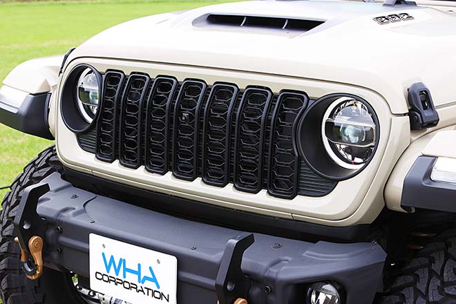オリジナルのフェイスリフトグリルに変更。フロントカメラの有無が選択可能で、未塗装だけでなく塗装済みもラインナップ。JLだけでなく、JTにも装着可能だ。金属製のバンパーは、ラギッドリッジのアーカスをチョイス。今回の車両は街乗りがコンセプトだが、非常にコンパクトなバンパーなので、本格的なオフロードでの走破性を高めてくれる。