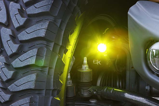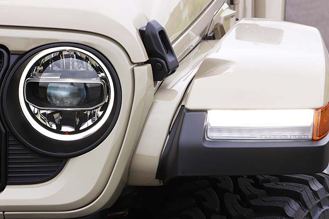 フロントサスペンションには、コーナーランプを装着。とくにラングラーはヘッドランプが中央に寄り気味なので、右左折時の安心感を高めることができる。