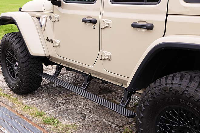 ドアの開閉に合わせ、自動的に作動する電動サイドステップも装着。リフトアップ車には必要不可欠なパーツと言えるだろう。
