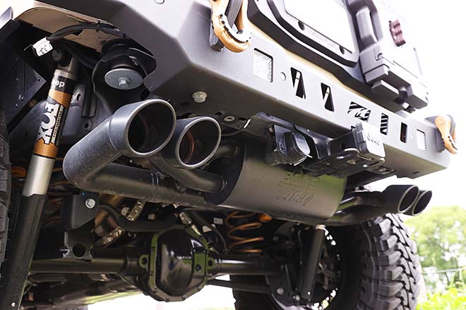 リアバンパーはモトビルト製のクラッシャーバンパーに変更。牽引フックも装備するが、ルビコン392 のイメージカラーであるゴールドで統一する。