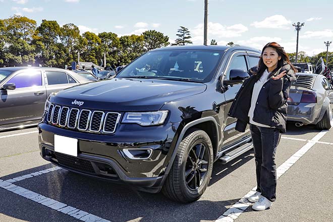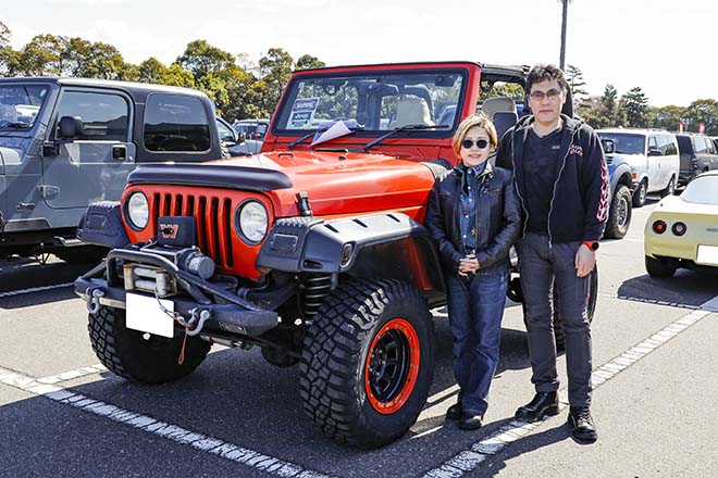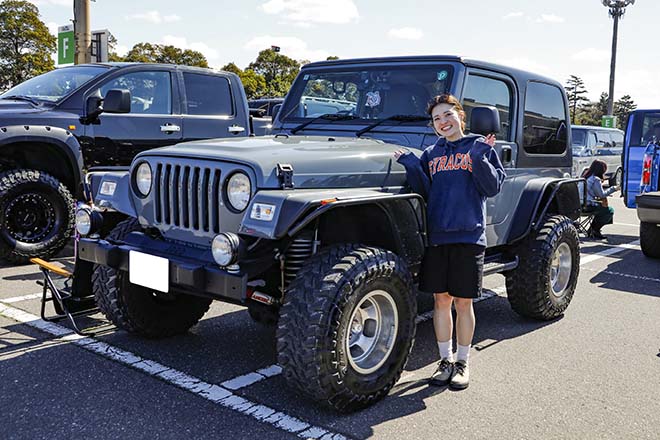 赤いTJラングラーのご夫婦は、ゆうさんのご両親。ジープ好きの両親に影響を受けて4年前にTJラングラーを購入。「色、バランス全てがお気に入りで、一生乗り続けたい相棒です!」と語るなど、自他共に認める生粋のジープ女子!
